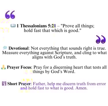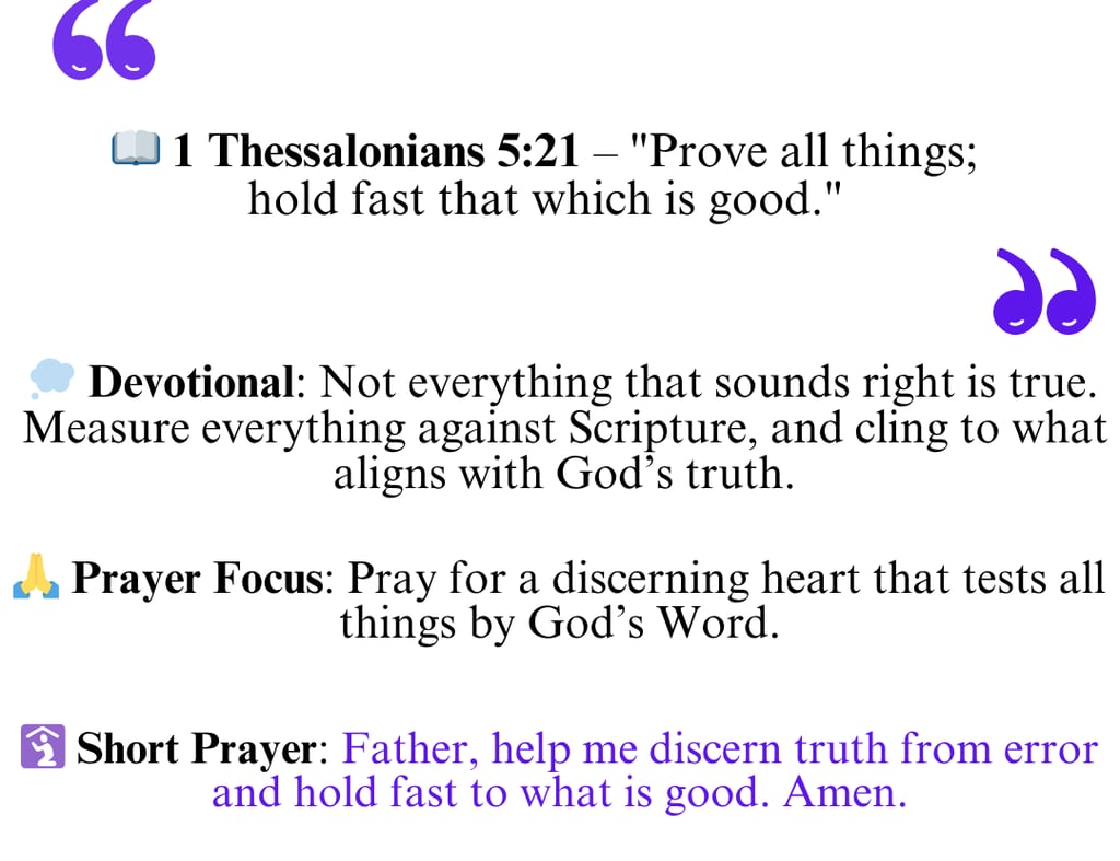 In daily life, this means being thoughtful and prayerful about what we believe, follow, or allow to influence us. Whether it’s advice, teaching, or opportunity, we should weigh it against Scripture and the guidance of the Holy Spirit. When we hold firmly to what is good, pure, and true, we stay rooted in God’s will and protected from deception.