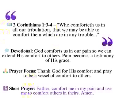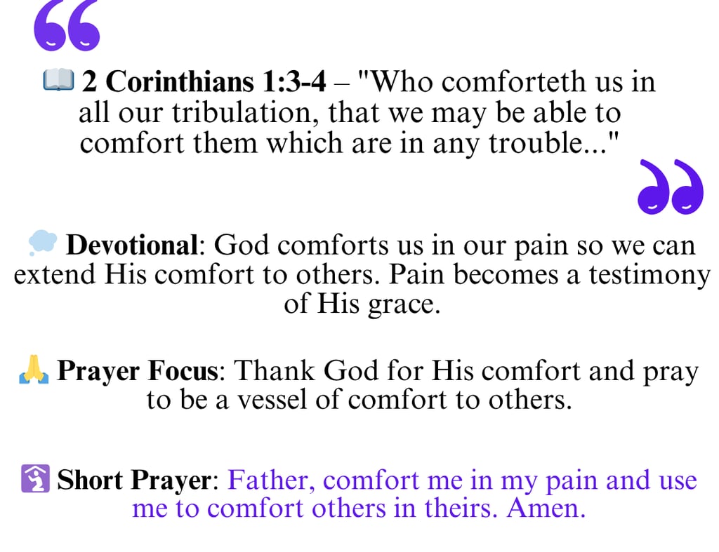 These verses reveal God’s heart as the source of comfort and compassion. He not only meets us in our pain and gives us peace, but He also equips us to pass that same comfort on to others. Our trials and healing become a testimony that strengthens those walking through their own struggles.