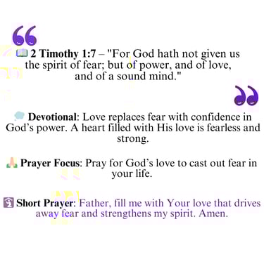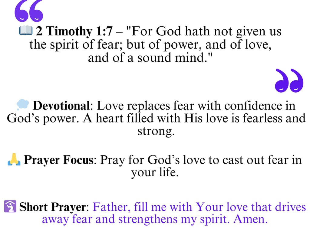 This verse reminds us that fear is not from God. Instead, His Spirit fills us with courage, strength, love, and clarity of mind. It is a call to walk in confidence, knowing that we are empowered to live boldly for His purpose.