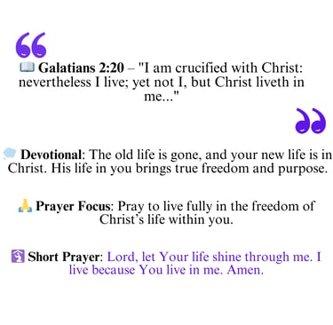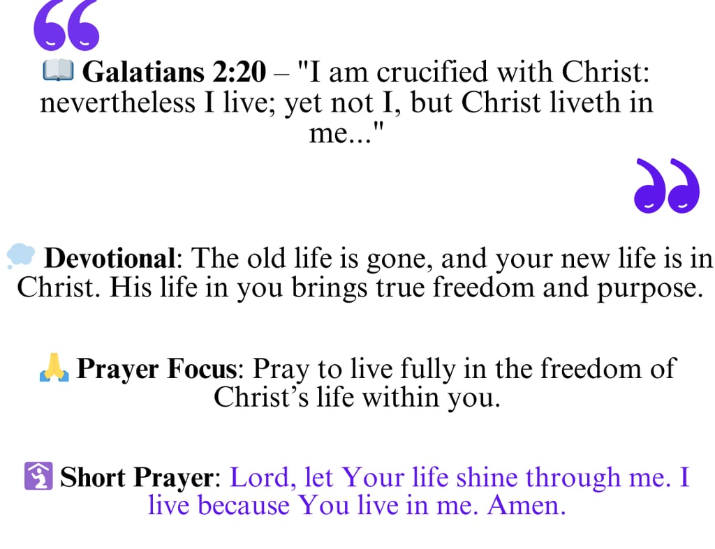 In daily life, this means surrendering our will to Christ and allowing His Spirit to guide how we think, act, and love. It’s a reminder that we are not alone.. Christ lives within us, empowering us to walk in faith, love, and obedience. Our life is not our own; it is a testimony to His grace and sacrifice.