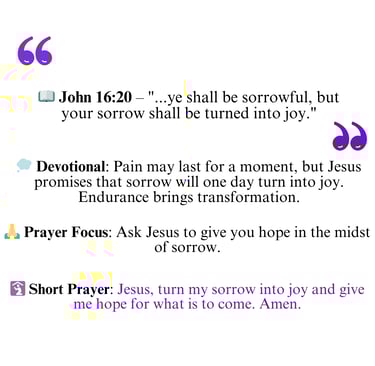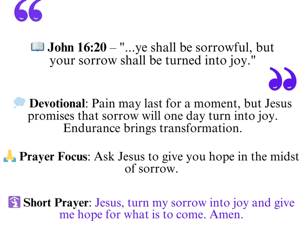 In daily life, this reminds us that seasons of pain and mourning are not permanent. God can take even the hardest moments and bring joy out of them. What feels overwhelming today can be the very thing God uses tomorrow to reveal His comfort, hope, and restoration. Our sorrow may last for a time, but in Christ, joy always has the final word.