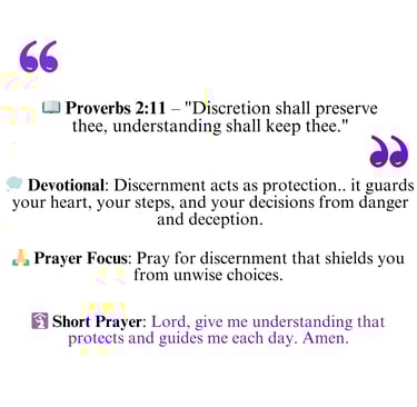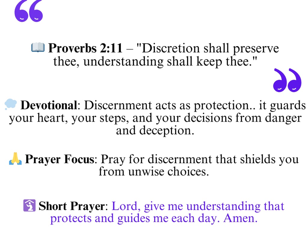 In daily life, this means allowing God’s Word and Spirit to shape our decisions. When we practice discretion—thinking before acting, seeking truth, and staying alert—God’s understanding becomes a guard over our hearts and minds. Wisdom isn’t just knowledge; it’s divine protection that keeps us safe and steady in every season.